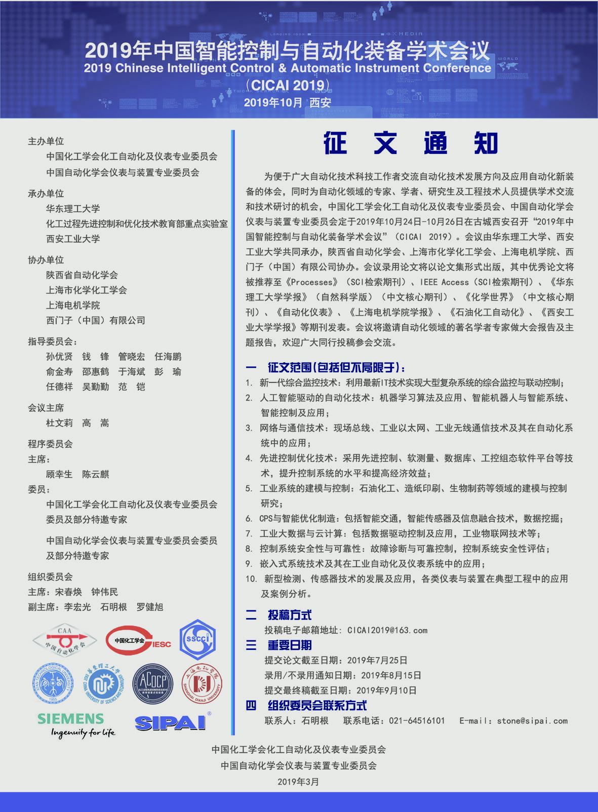 为便于广大自动化技术科技工作者交流自动化技术发展方向及应用自动化新装备的体会,同时为自动化领域的专家、学者、研究生及工程技术人员提供学术交流和技术研讨的机会,中国化工学会化工自动化及仪表专业委员会、中国自动化学会仪表与装置专业委员会定于2019年10月24日——10月26日在古城西安召开“2019年中国智能控制与自动化装备学术会议”(CICAI 2019)。会议由小妲己直播 、西安工业大学共同承办,陕西省自动化学会、上海市化学化工学会、上海电机学院、西门子(中国)有限公司协办。会议录用论文将以论文集形式出版,其中优秀论文将被推荐至《Frontier of Chemical Science and Engineering》(SCI检索期刊)、《Processes》(SCI检索期刊)、IEEE Access(SCI检索期刊)、《小妲己直播 学报》(自然科学版)(中文核心期刊)、《化学世界》(中文核心期刊)、《自动化仪表》、《上海电机学院学报》、《石油化工自动化》、《西安工业大学学报》等期刊发表。会议将邀请自动化领域的著名学者专家做大会报告及主题报告,欢迎广大同行投稿参会交流。