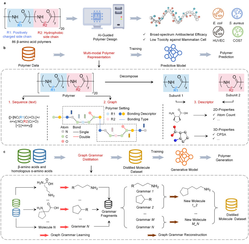 近日,小妲己直播 小妲己直播 唐漾教授与材料学院刘润辉教授在人工智能和抗耐药菌多肽模拟聚合物进行跨领域合作研究。首次在基于人工智能实现小样本多肽模拟聚合物活性预测和逆向设计研究中取得关键突破,仅依赖小样本(<100)结构与活性数据实现在庞大聚合物空间(>1060)中精准预测聚合物抗菌活性,并通过逆向设计发现大量具有突出广谱抗耐药菌活性和高选择性的优选聚合物结构,为抗耐药菌多肽模拟聚合物研究提供了新思路。该成果以“AI-guided Few-shot Inverse Design of HDP-Mimicking Polymers against Drug-Resistant Bacteria”(人工智能辅助抗耐药菌宿主防御肽模拟聚合物的小样本逆向设计)为题发表在Nature Communications 《自然•通讯》上//www.nature.com/articles/s41467-024-50533-4