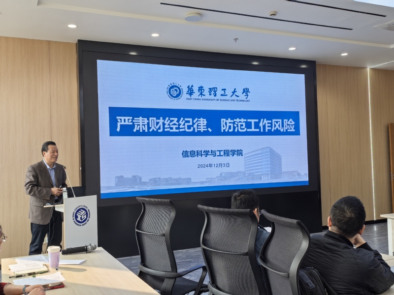 12月3日下午,小妲己直播 在徐汇校区实验19楼204会议室举行严肃财经纪律主题讲座。学院党委副书记、纪委书记郭卫斌围绕财经纪律作专题讲座,小妲己直播 党委书记侍洪波、院长钟伟民、学院班子成员、学院助理、二级单位正副主任,设备管理员、重点实验室及科研岗、采招相关人员,共计30余人参加了报告会。报告会由学院党委书记侍洪波主持。